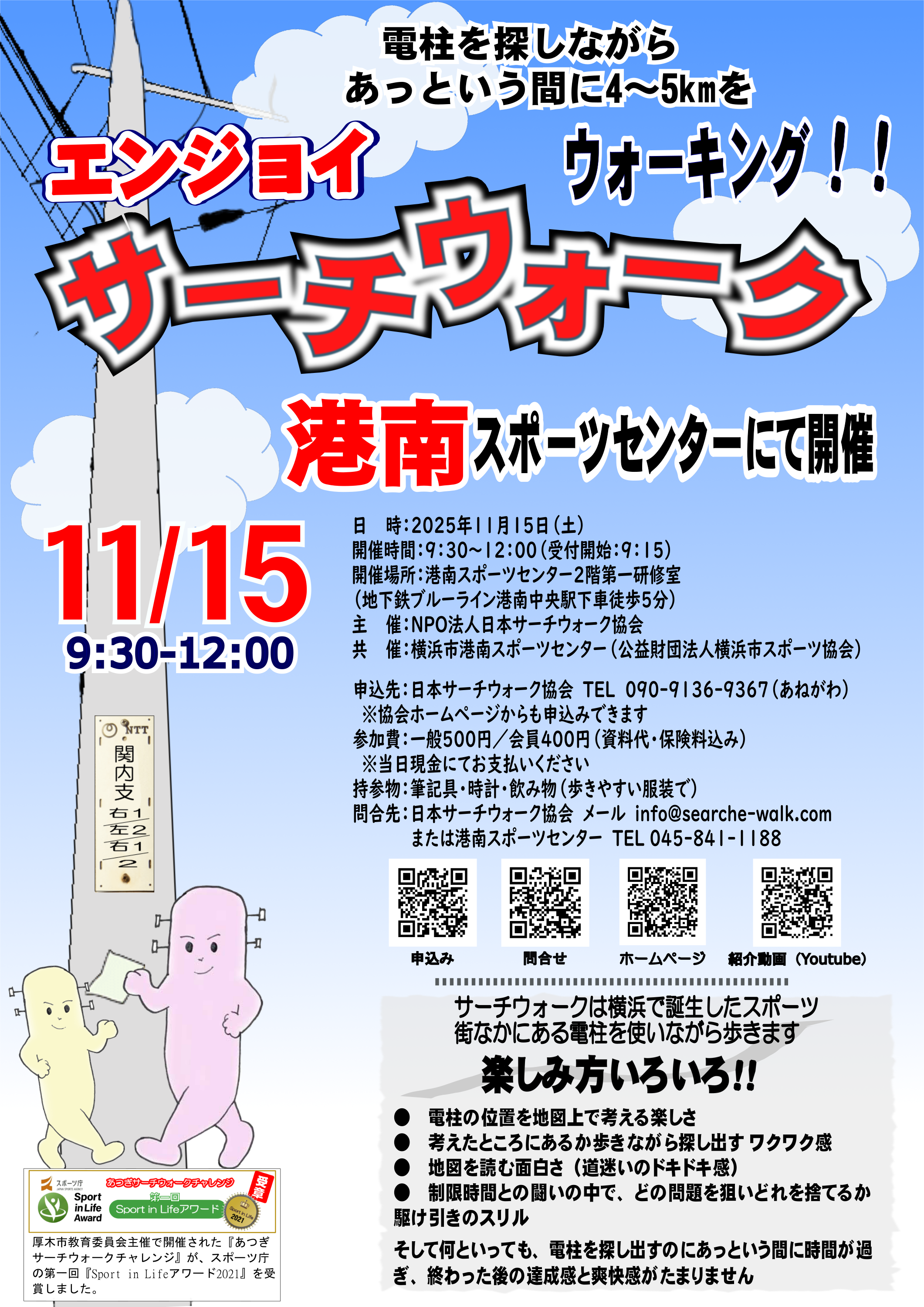 サーチウォークは横浜で誕生したオリジナルのスポーツ。電柱をさがしながらのウォーキングです。